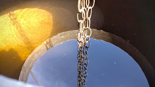 We previously built a first flush diverter to improve the quality of the rainwater we collect off of the roofs, and it has been working quite well. The first rains fill up the diverter with water that contains dust and animal droppings from the roof, and then after that, the water comes down a chain to full up the collection urns.